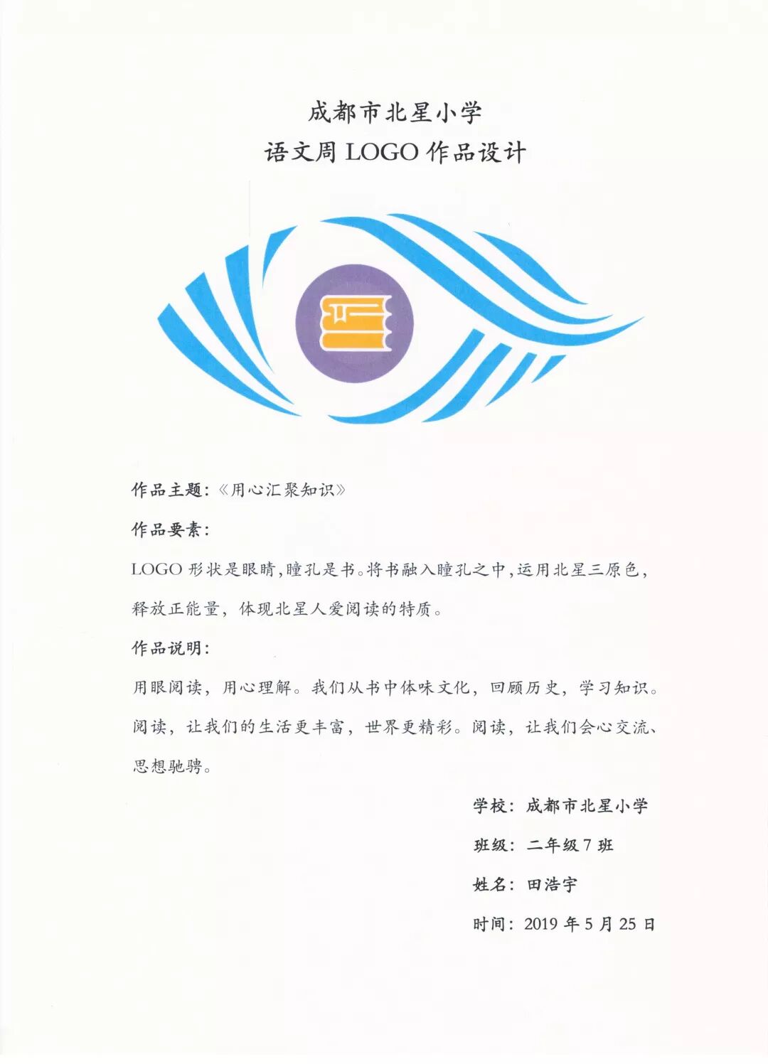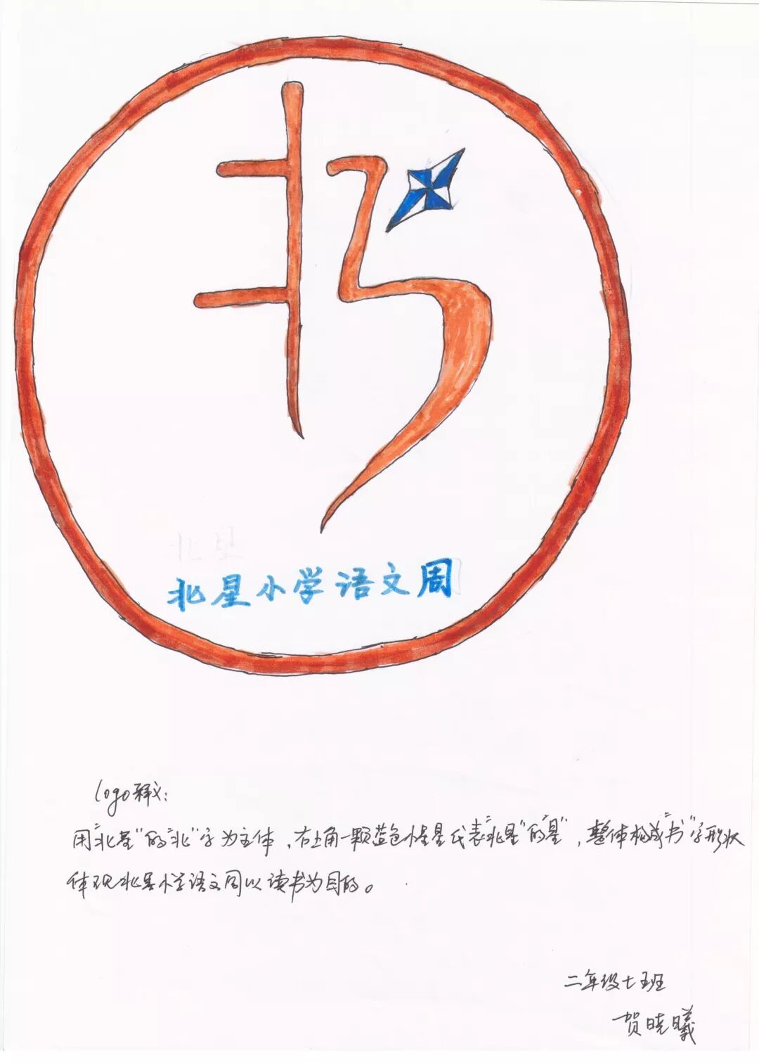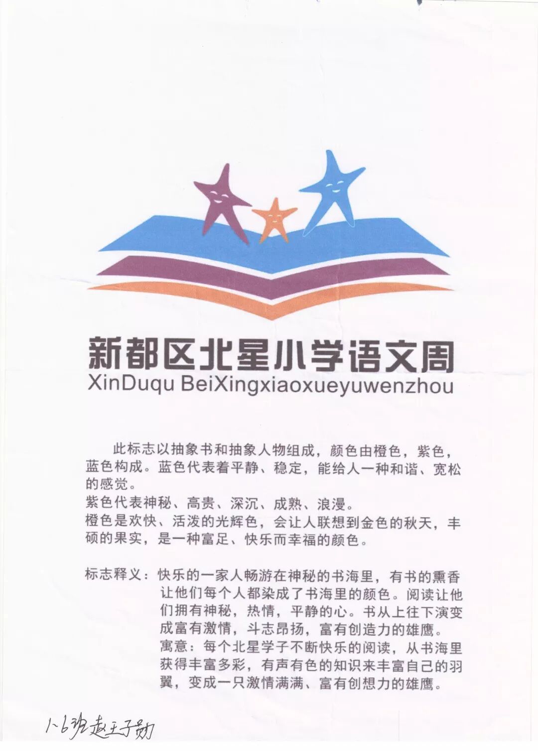 以北星的“北”字为主体,右上角一颗蓝色的小星星代表北星的“星”,整体构成“书”字的形状,体现北星小学语文周以读书为目的。