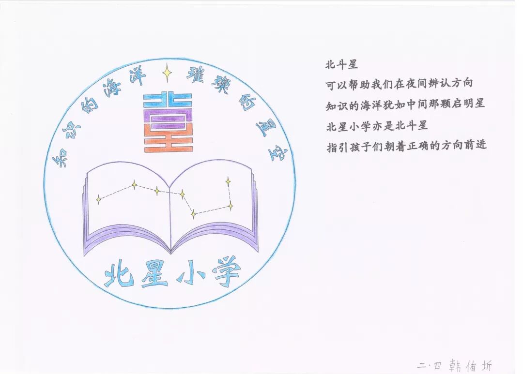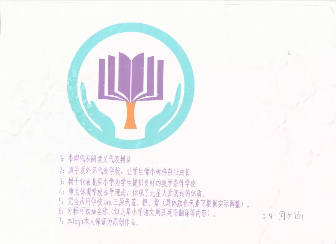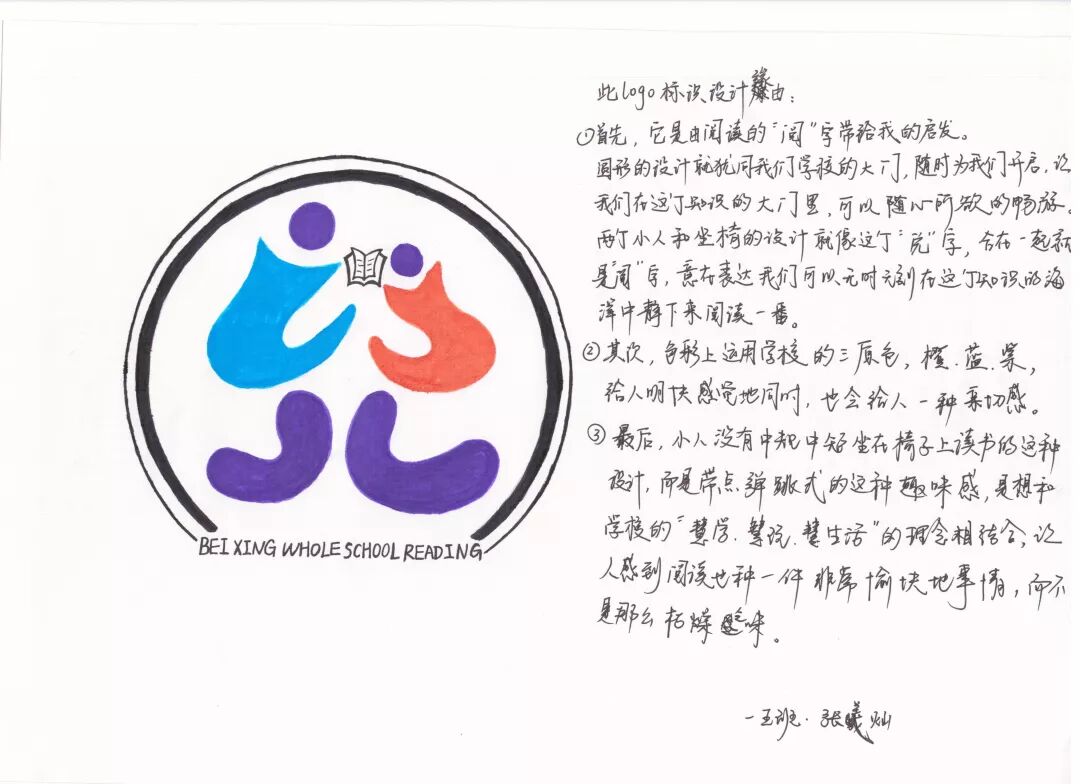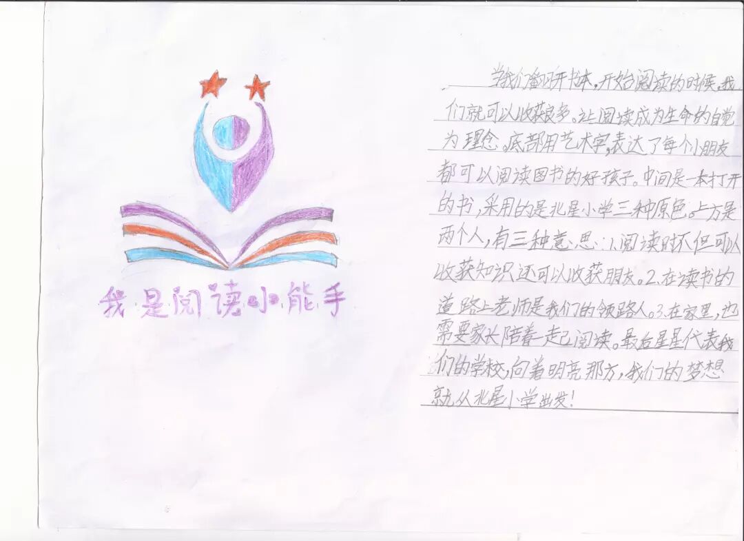 当我们翻开书本,开始阅读的时候,我们就可以收获良多。让阅读成为生命的自觉为理念。底部用艺术字,表达了每个小朋友都可以是阅读图书的好孩子。中间是一本打开的书,采用的是北星小学三种原色。上方是两个人,有三种意思:1阅读时,不但可以收获知识还可以收获朋友。2.在读书的道路上老师是我们的领路人。3.在家里,也需要家长陪着一起阅读。最后星星代表我们的学校,向着明亮那方,我们的梦想就从北星小学出发!