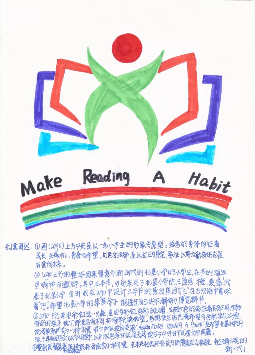 3.Logo下方采用彩虹这一元素,是因为彩虹色彩斑斓,五颜色的象征着具有不同性格特点的孩子,虽然他们各有不同,但是同样充满希望。若想使生活充满希望与色彩就必须使阅读成为一种习惯。我之所以使用英语“Make Reading A Habit”是希望北星小学的孩子具有国际化的视野,以开放包容的态度去阅读古今中外的优秀文学典籍。