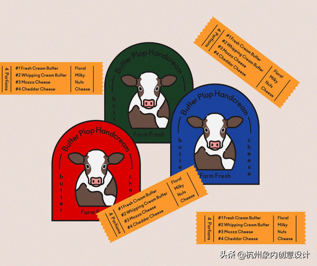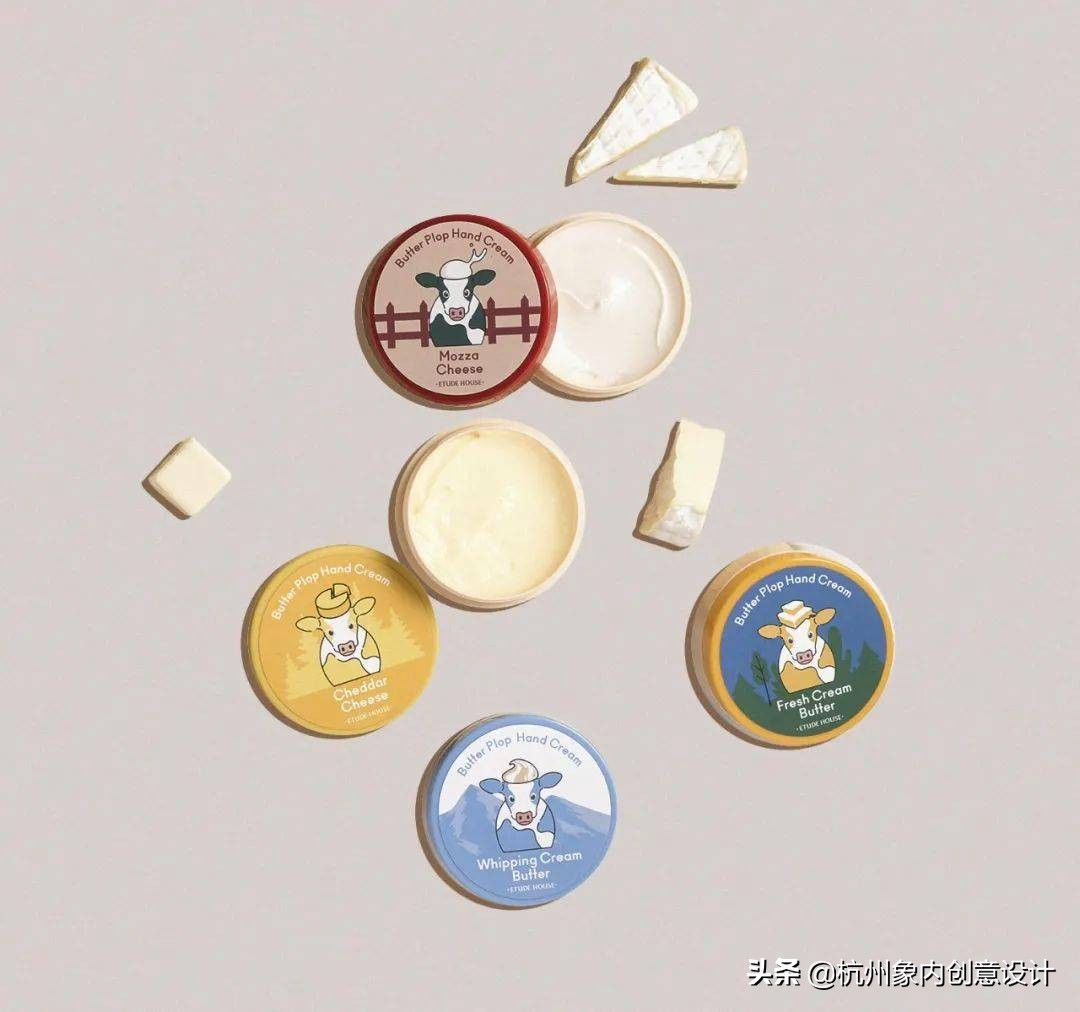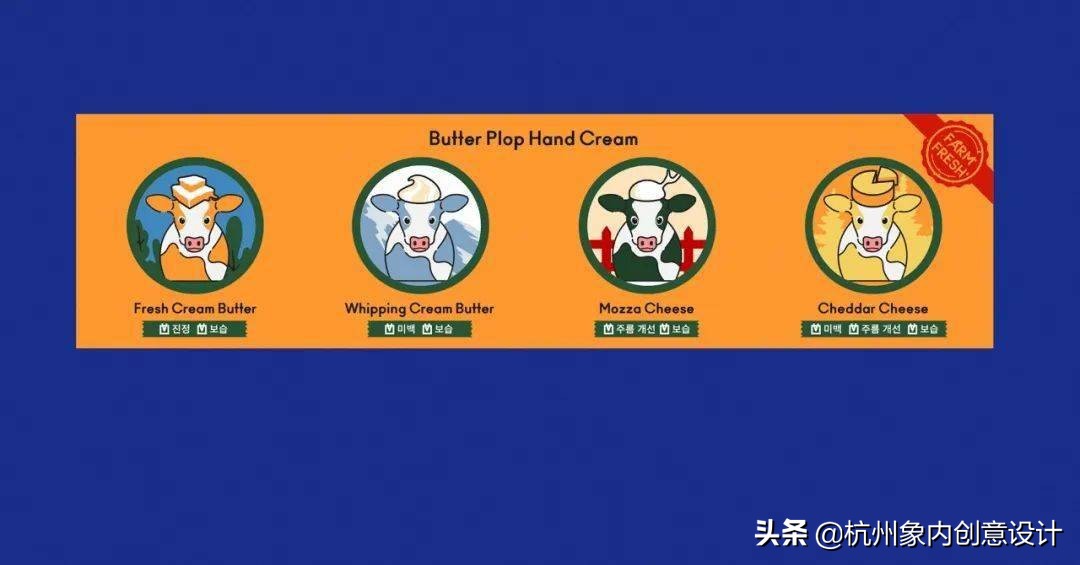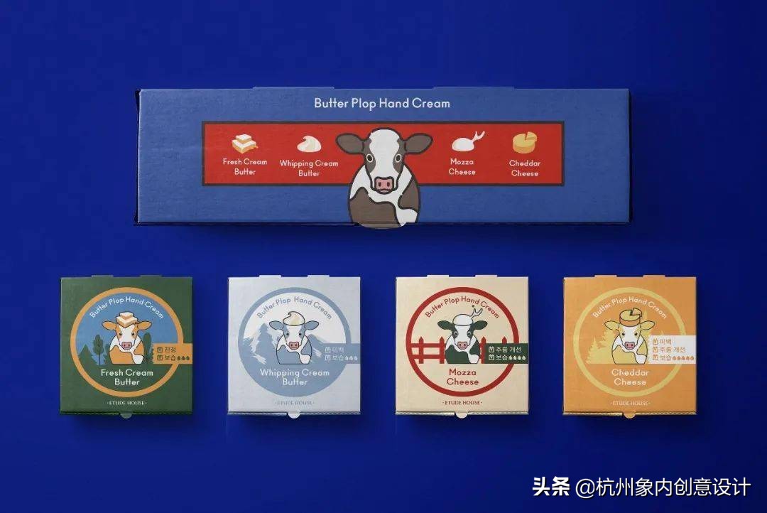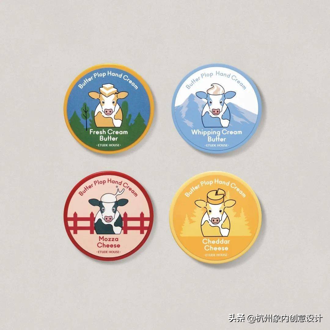意念源自于乳酪和奶油的基本概念,用乳牛隐喻了保养品的成份。用色调和相同的插图原素,界定任一款商品的相同类别。