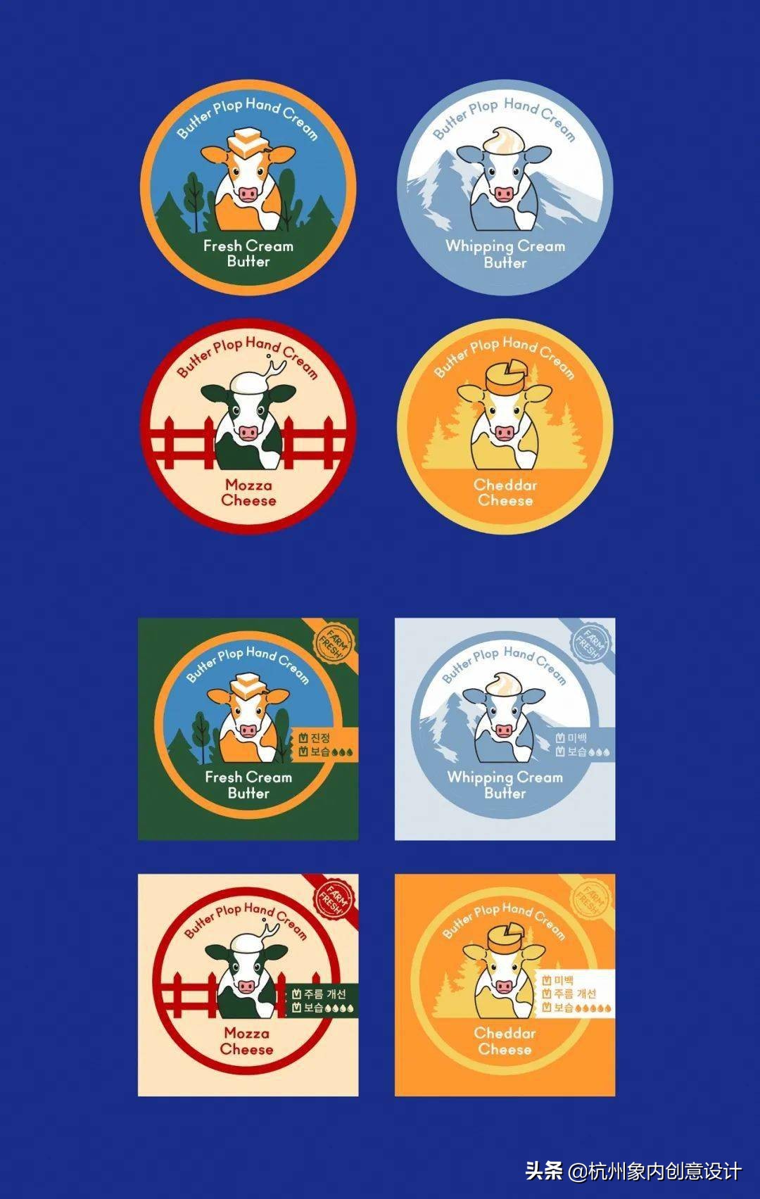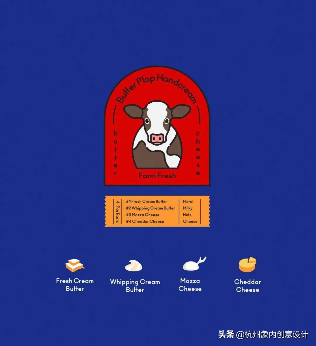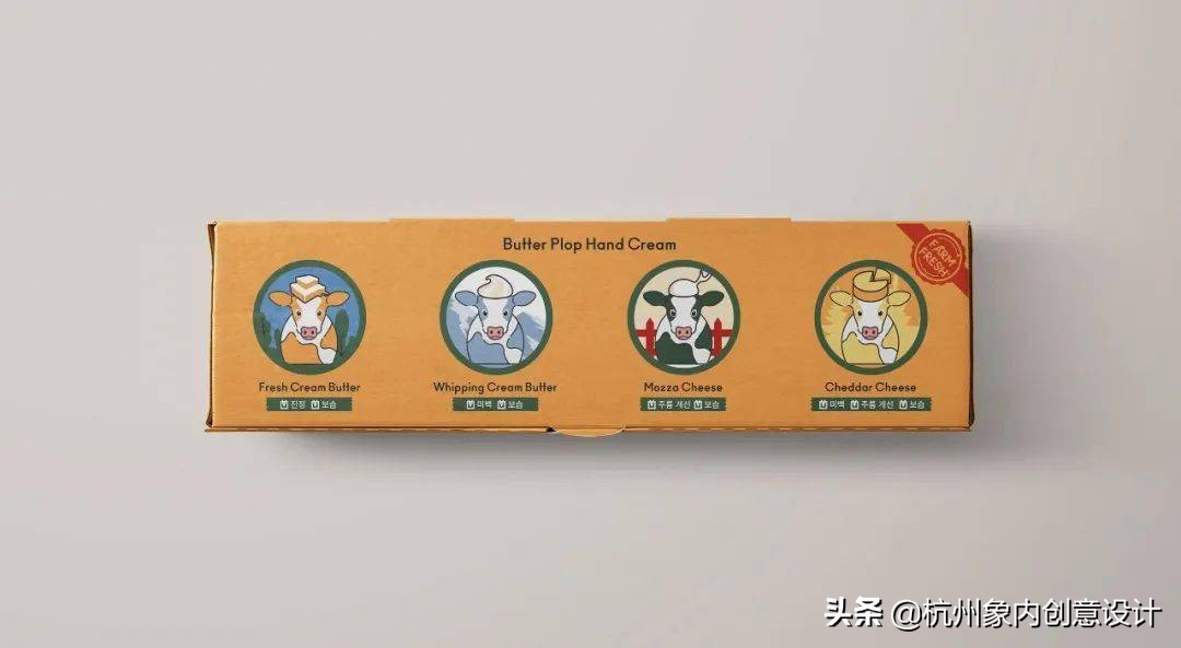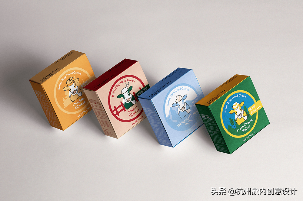 意念源自于乳酪和奶油的基本概念,用乳牛隐喻了保养品的成份。用色调和相同的插图原素,界定任一款商品的相同类别。