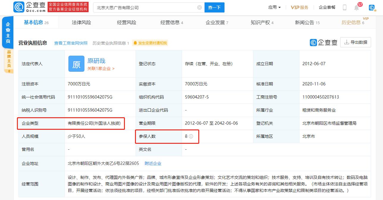3月30日,小米公司宣布更换全新logo,由国际知名设计师原研哉与小米携手推出。企查查APP显示,原研哉目前担任北京大思广告有限公司法定代表人,该公司成立于2012年6月,参保人数为8人,企业类型为有限责任公司(外国法人独资),该公司主要人员共6人。