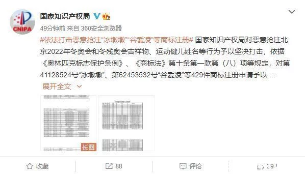 广告国家工商商标查询商标查询系统入口>>>@国家知识产权局 官微今日发文称:国家知识产权局对恶意抢注北京2022年冬奥会和冬残奥会吉祥物、运动健儿姓名等行为予以坚决打击,依据《奥林匹克标志保护条例》、《商标法》第十条第一款第(八)项等规定,对第号“冰墩墩”、第号“谷爱凌”等429件商标注册申请予以驳回。