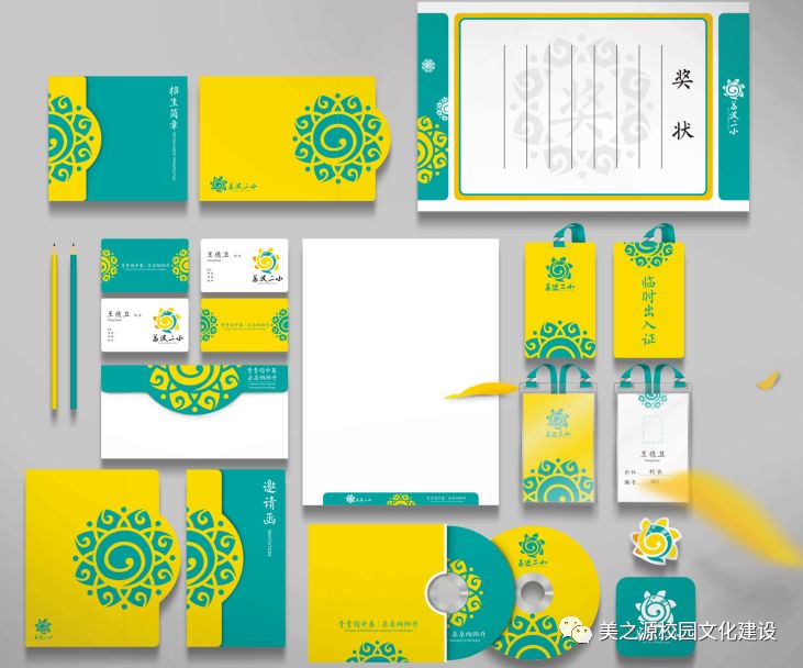 荔波二小以“向阳教育”为办学特色,“向阳花”作为文化载体被融合应用到学校的整套VI系统中,“向阳教育”特色品牌通过这套VI得到很好的呈现和传播。阳光温暖的主色调,配合荔波青色的地域特质,很好呈现出“青青园中葵,朵朵向阳开”的主题文化,书写出向着阳光那方生长的学校品牌自我生长记。