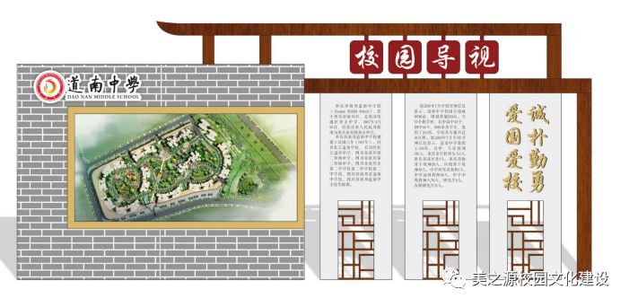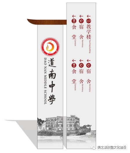 道南中学延承百年文化底蕴,选用巴渝建筑翘角风格,用铝板画描绘老校区代表建筑群,历史在VI中得到了继承和延续。