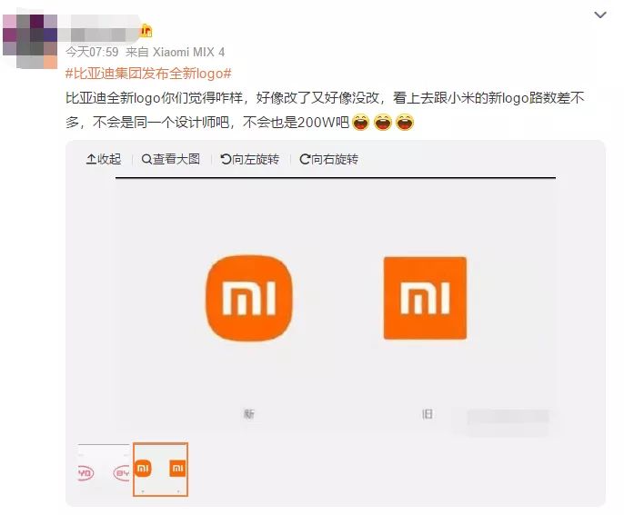 由于新旧标识变动不大,消息一出,“比亚迪集团发布新logo”今日早间一度冲上微博热搜第一。网友纷纷热议这次的设计“巨款”花得值不值。有网友调侃:看上去跟小米的新logo路数差不多,不会是同一个设计师吧,不会也是200万吧……