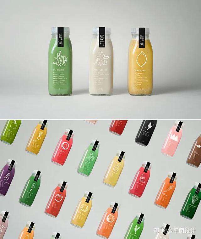 ④极简风格的果汁包装风格。采用极简手法的果汁瓶签包装设计也是比较流行的种设计方式。极简主义的果汁类饮料瓶签包装设计标签正面所展示的内容一般很少,但均为主要信息,例如果汁类饮料的品牌名称、口味和logo等,使消费者快速获取所有重要信息。
